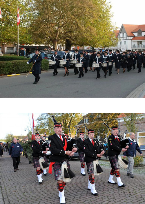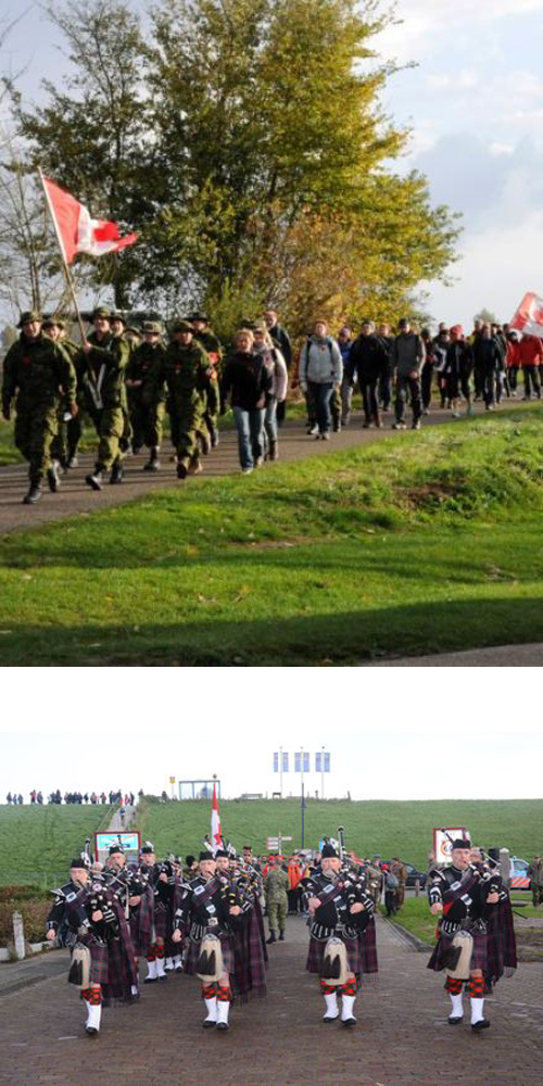 The first weekend of every November the people of Belgium and the Netherlands get together to remember the Canadian soldiers that lost their lives during the battle of the Scheldt and invite the Canadian Delegation from Joint Force Command Brunssum and Canadian teachers and students from AFNORTH school to join them in remembering. This year the weekend fell on 4-7 November. The third day, the Delegation don their combats drove to Hoodfplaat, Netherlands took a group photo and start the day with a parade that end with the parade marching off through the town to start the 33km walk that our forefathers did in WWII. Throughout the day you see the country side of the Netherlands and Belgium and think of what it would have been like all those years ago. The Canadian Delegation stops two times during the walk to have a few remembrance ceremonies with the locals and at the end of the march the delegation parades into the town of Knokke Heist ending with a parade and a quick walk to city hall to celebrate with the town. The CO of the Canadian Delegation, LCol Rebecca Barton, commanded the Delegation and the Delegations Sergent Major, MWO Kim Doerr. Photo’s Sgt Samantha Crowe, Canadian Armed Forces Imagery Technician, Allied Joint Force Command Brunssum.
