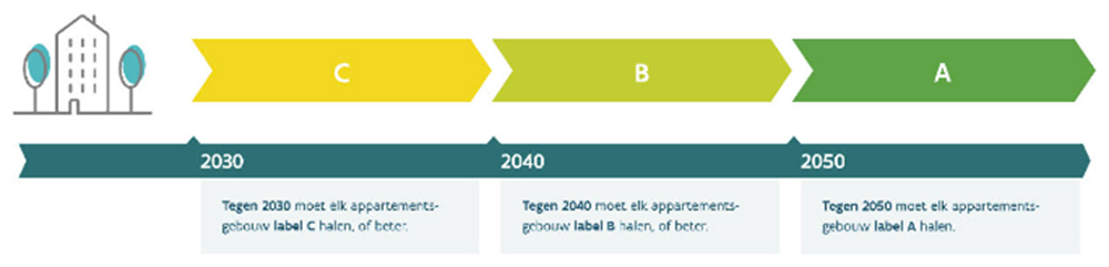 Voor appartementsgebouwen is het voorstel om vanaf 2030 een bijkomend traject te volgen, waarbij een minimaal gebouwlabel zal worden opgelegd aan het appartementsgebouw in zijn geheel los van verkoop. Dit traject zal in het voorjaar van 2024 in de regelgeving worden vastgelegd.