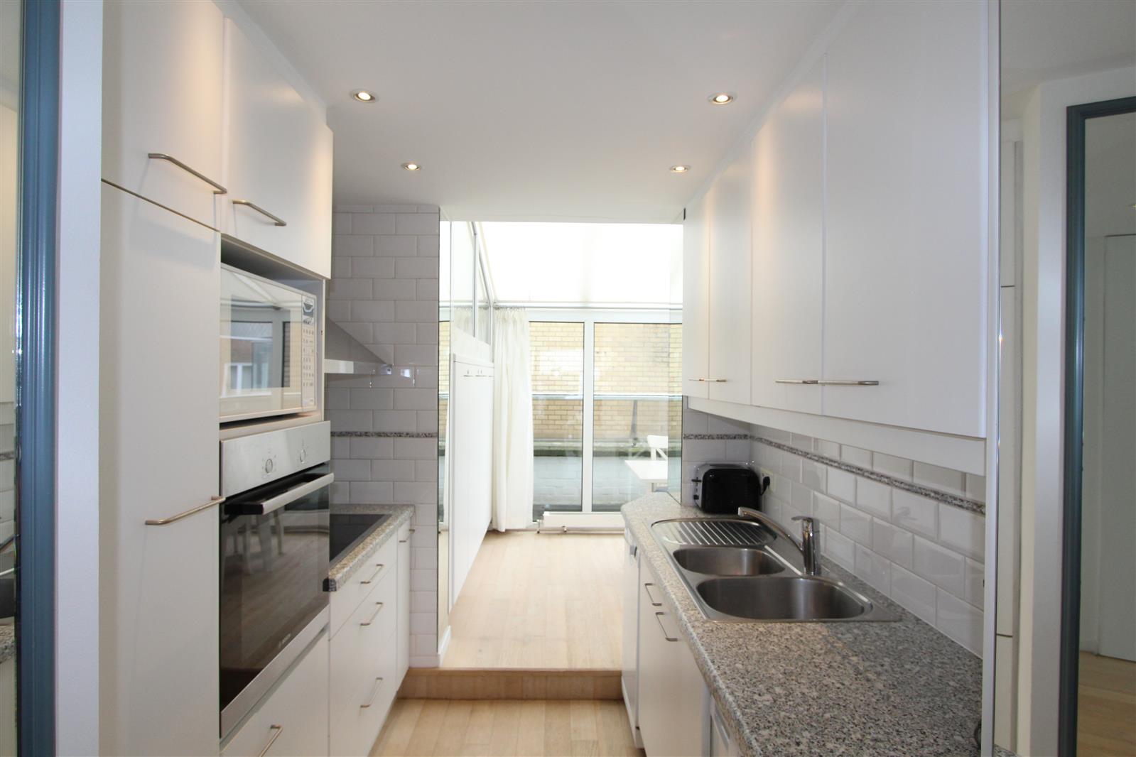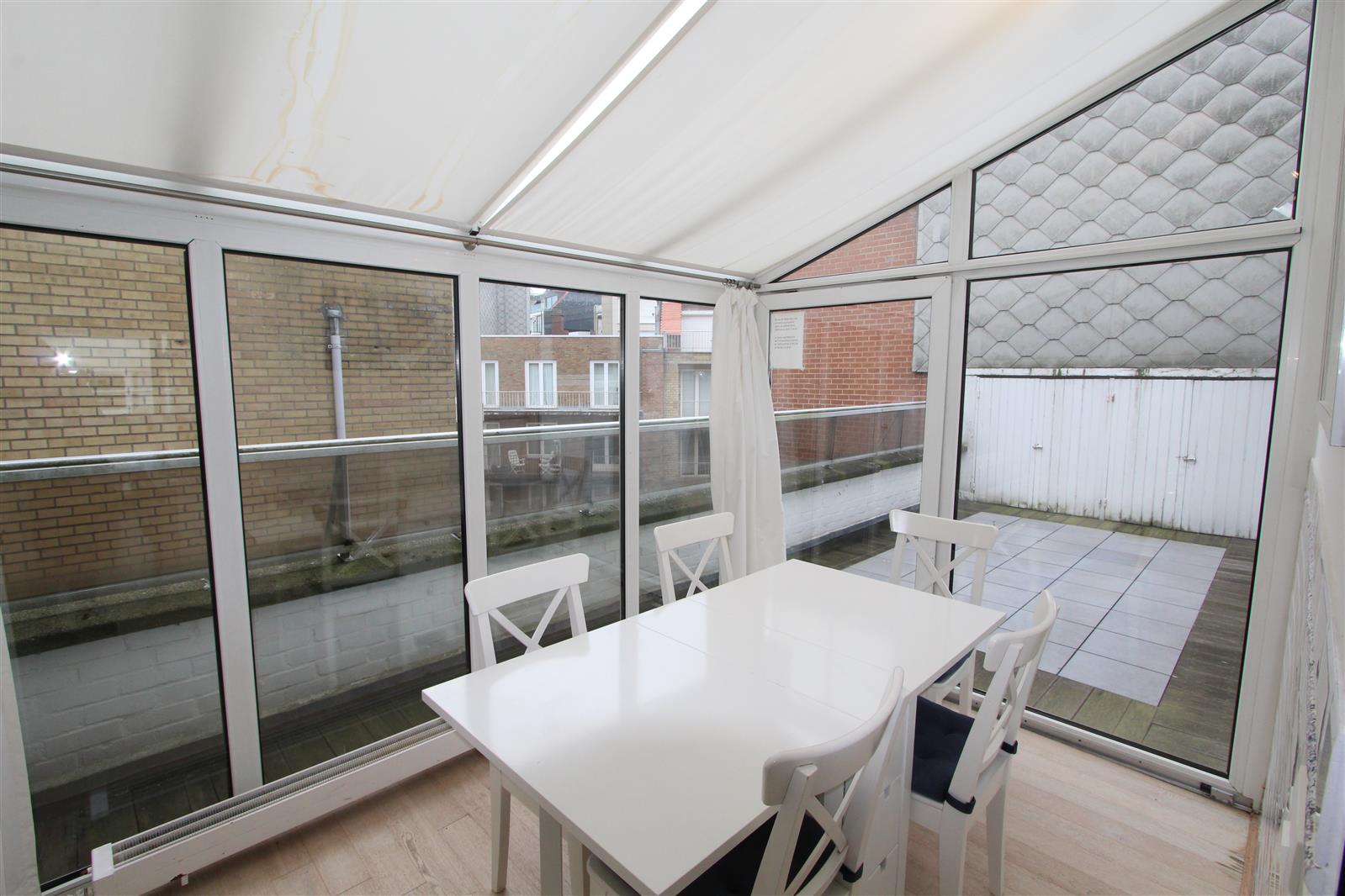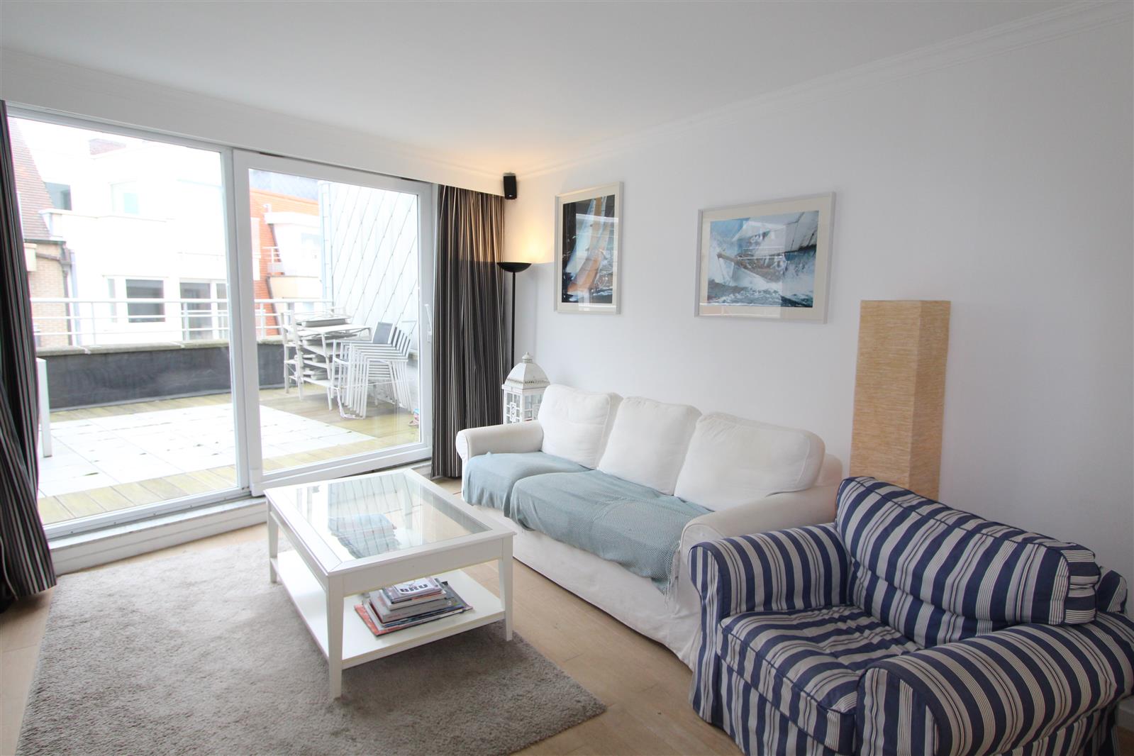Deze gezellige penthouse bevindt zich in de buurt van het Albertplein en beschikt over een groot terras vooraan waar u kan genieten van een uitgestrekt zijdelings zeezicht. Garagebox inbegrepen.